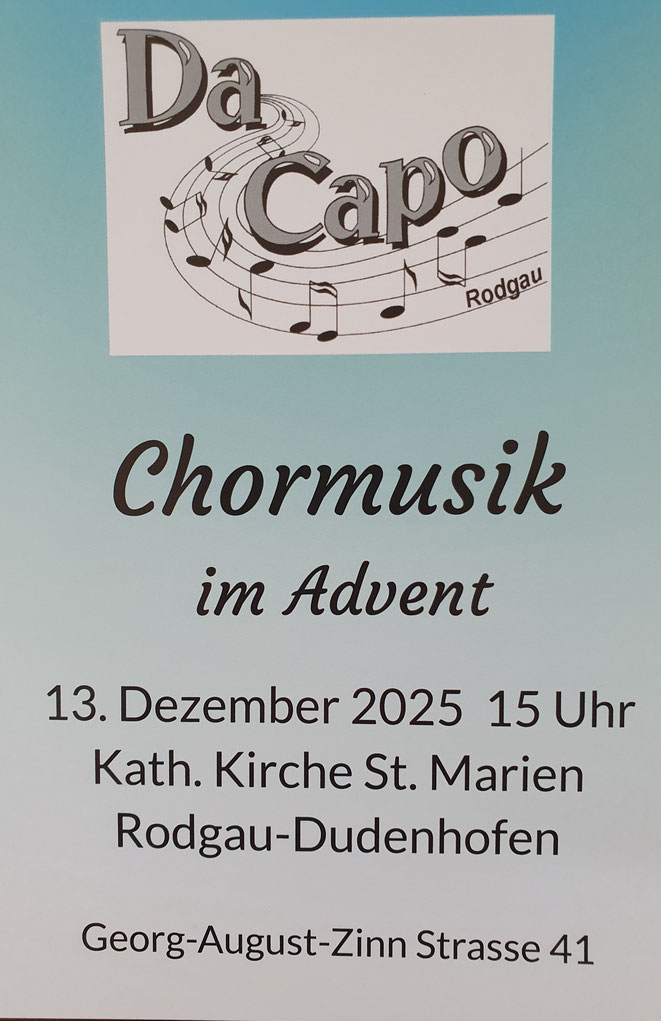 Neue Sängerinnen und Sänger sind bei Da Capo stets willkommen. Die Proben finden freitags von 20.00 bis 21.30 im Bürgerhaus Weiskirchen statt. Der nächste Auftritt ist für den 22. Juni beim Open